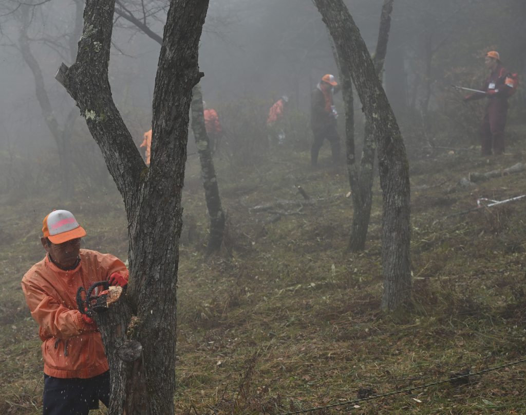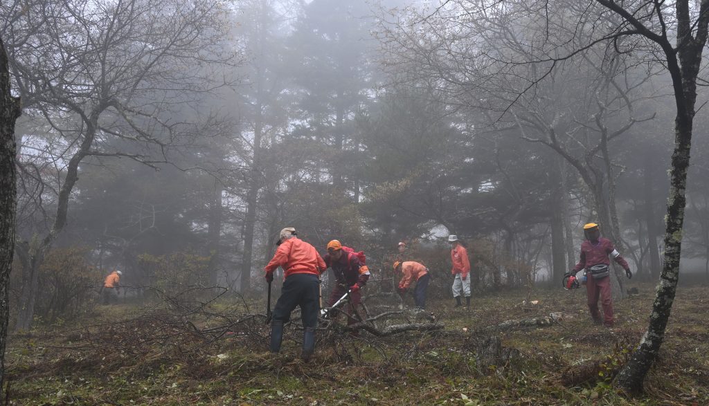 来年の春に向けて、伐採チームが地面に日の光が入るようズミの枝などを手入れ。その効果で春に芽吹く半日蔭の山野草が毎年増えて来ていますが、もっともっと!