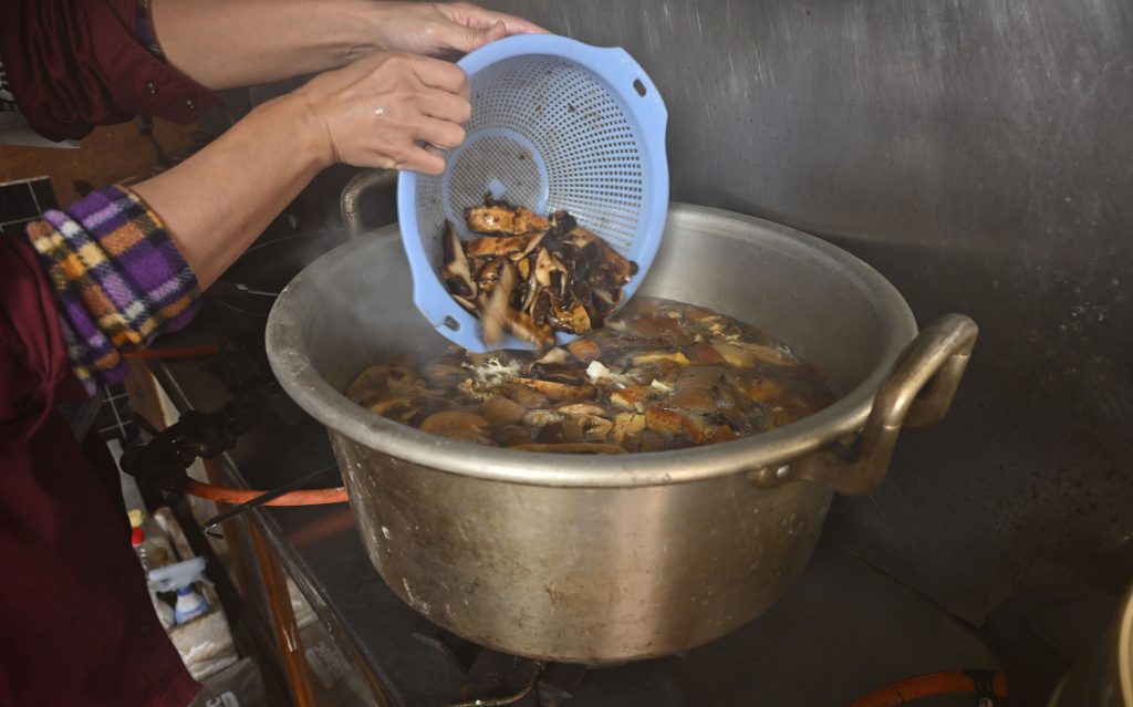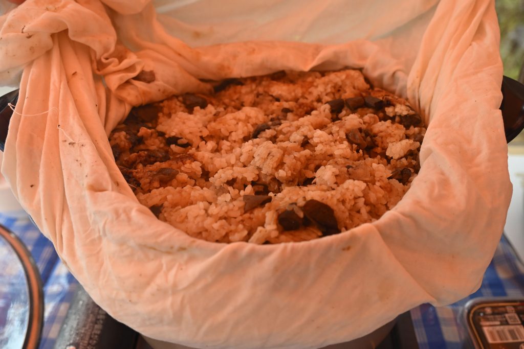 入笠山麓で採取したジコボウ(ハナイグチ・ヌメリイグチ)とお隣り北杜市の武川米を使用したキノコご飯を前日から仕込みましたが、